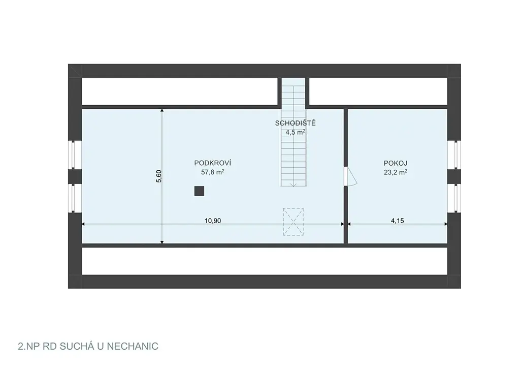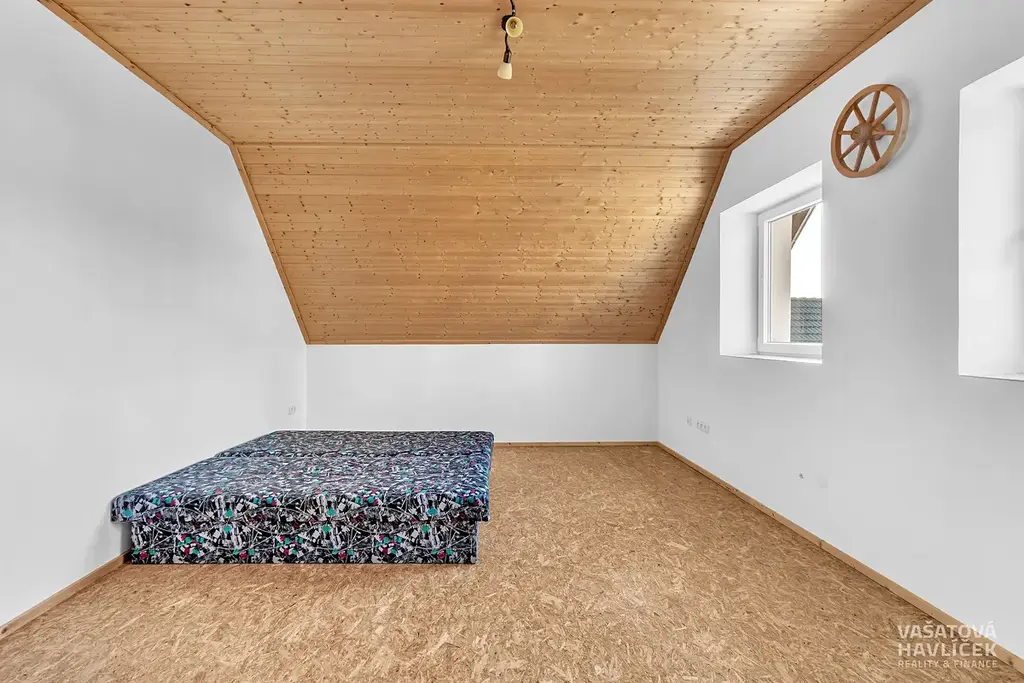 V podkroví (cca 81 m²) je velká hala a samostatný pokoj, které lze využít dle vlastních představ. Podlahovou krytinu zde tvoří dřevovláknitá deska.