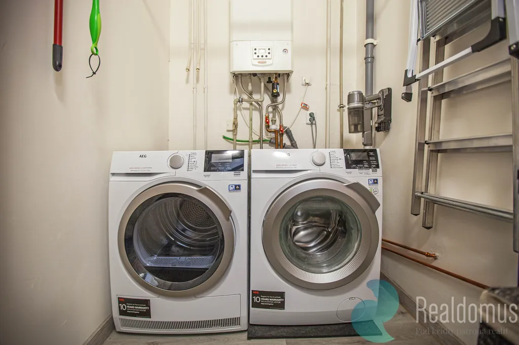 Dispozice bytu tvoří prostorné a světlé místnosti s vysokými stropy, které dodávají interiéru vzdušnost. Součástí bytu je také technická místnost s prostorem pro pračku, sušičku a kotel zajišťující vytápění i ohřev teplé vody. Součástí kuchyně je prostorná spíž, která poskytuje dostatek úložného prostoru pro potraviny i domácí potřeby. Koupelna je samostatná, WC odděleně.