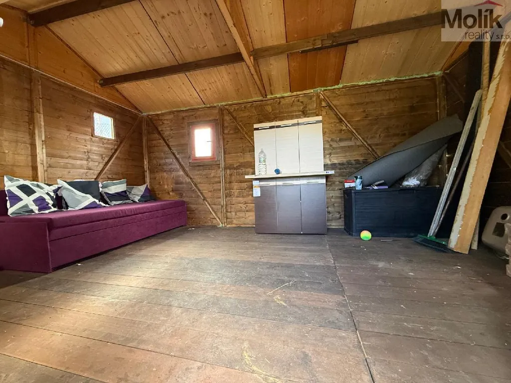 Součástí pozemku je dřevěný zahradní domek, ve kterém je k dispozici nová podlaha (zabalená) a kuchyňská linka s dřezem, oválný bazén, záhony.