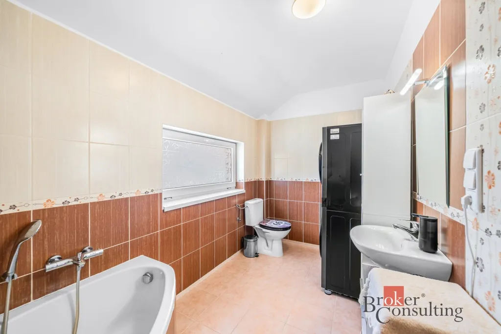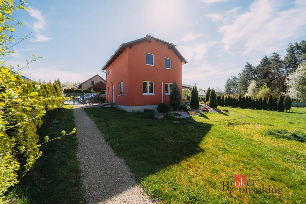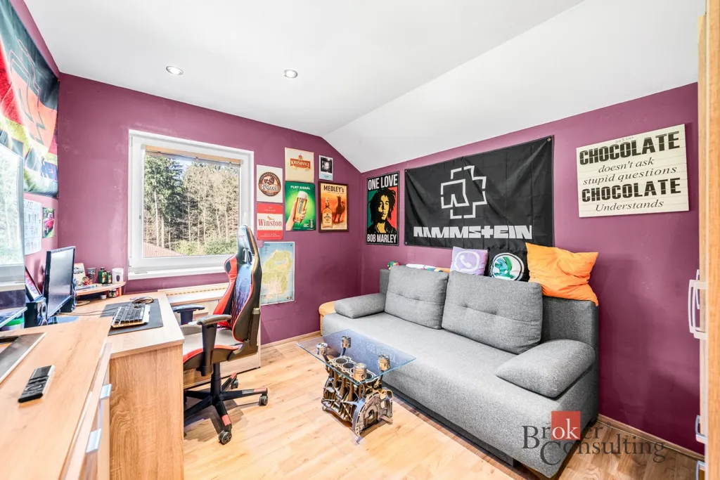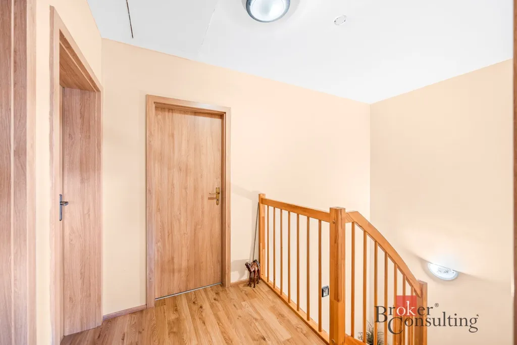 V patře domu jsou umístěny dva dětské pokoje, ložnice a druhá koupelna vybavená vanou, což poskytuje dostatek komfortu pro vícečlennou rodinu.