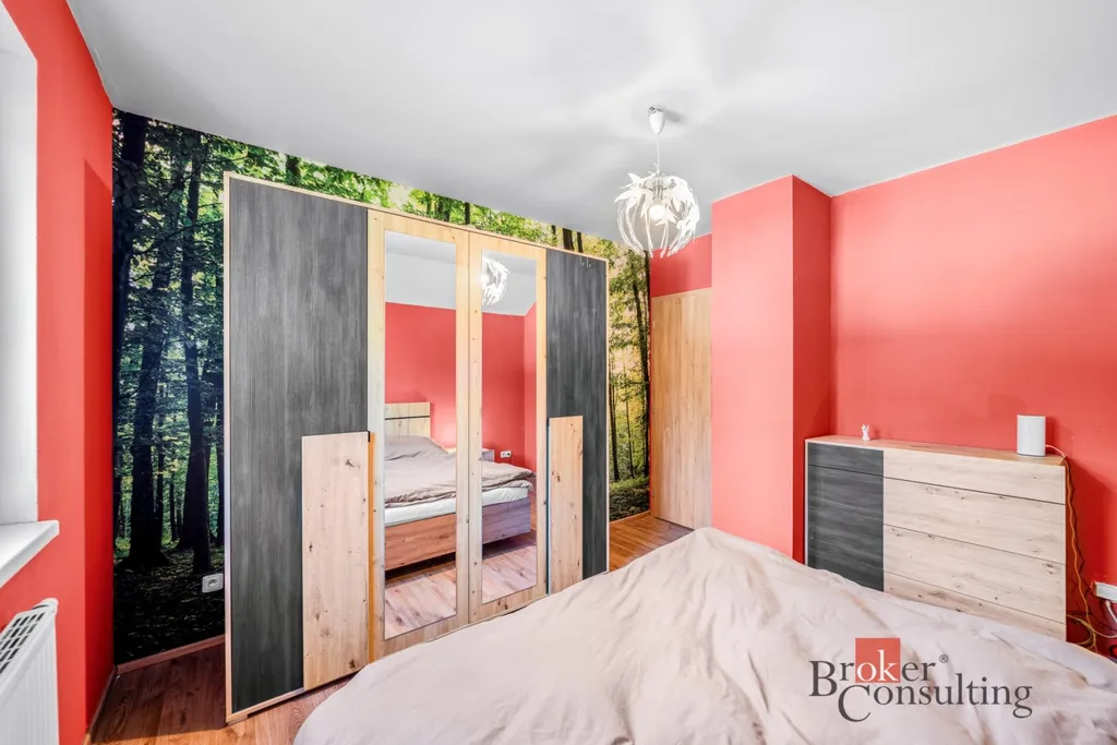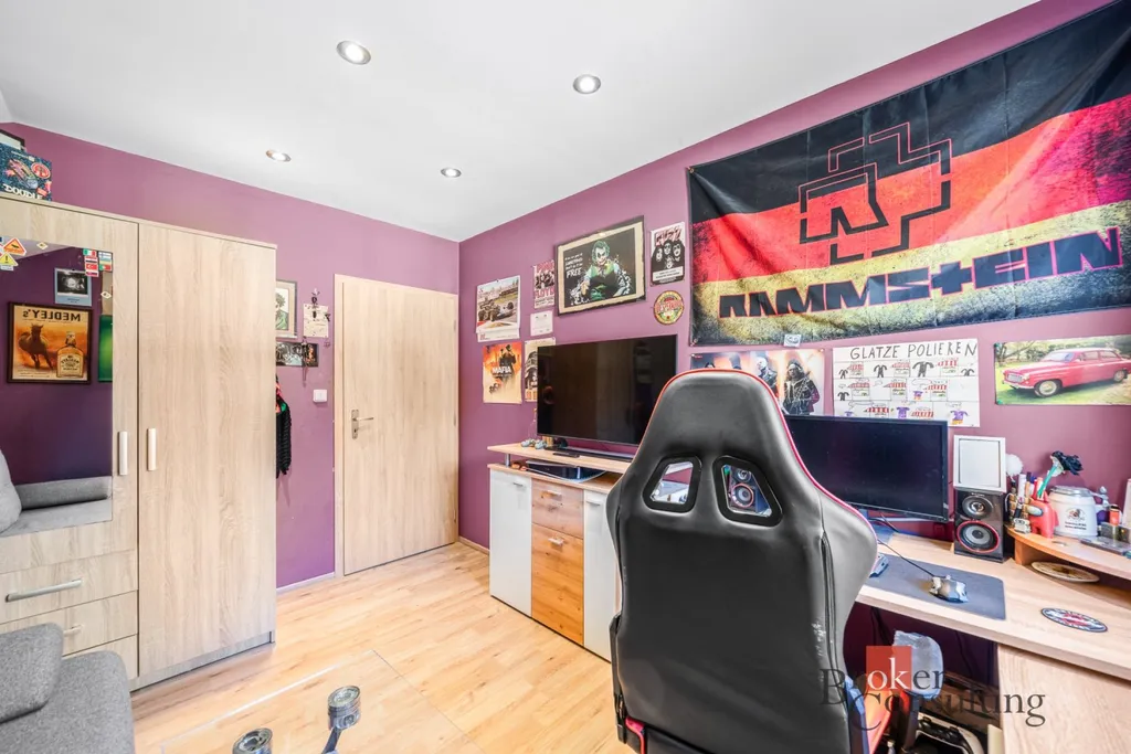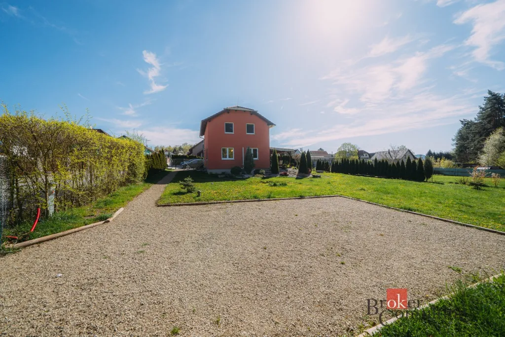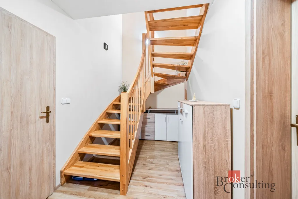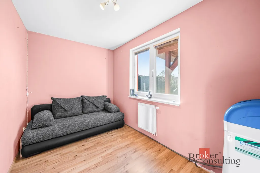 V patře domu jsou umístěny dva dětské pokoje, ložnice a druhá koupelna vybavená vanou, což poskytuje dostatek komfortu pro vícečlennou rodinu.