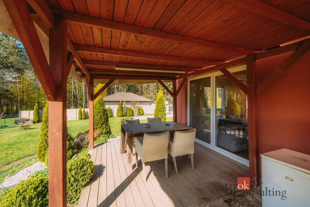 Velkým benefitem je krytá terasa orientovaná do zahrady a směrem k lesu, která poskytuje příjemné soukromí a možnost využití od jara až do podzimu.