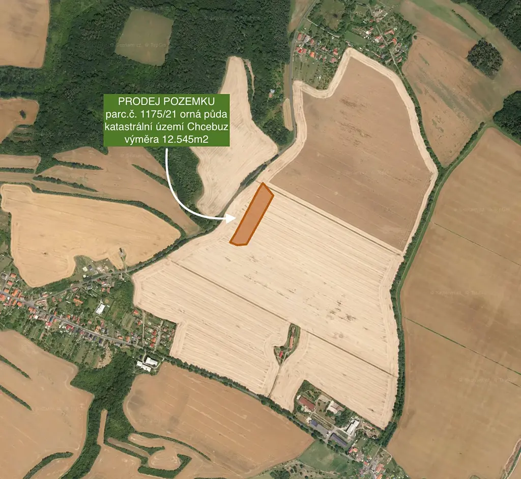 Nabízíme ke koupi pozemek orné půdy o celkové výměře 12.545m2 nacházející se v katastrálním území Chcebuz zapsaný na listu vlastnictví č. 49. Pozemek je využívaný jako orná půda a je pronajatý místnímu hospodáři do na dobu neurčitou s jednoletou výpovědní lhůtou.