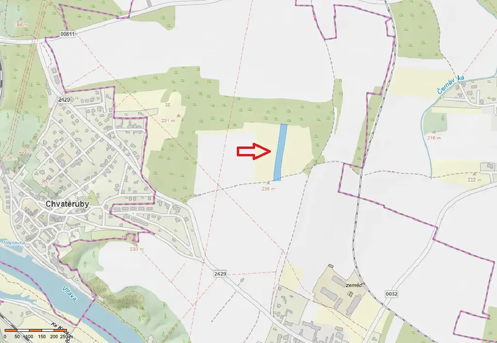 Pozemek se nachází v lokalitě U Křížku, východně od obce Chvatěruby a severně od obce Zlončice, s přímým přístupem z obecní komunikace. Vzdálenost 1 km od silnice II/608 a 2 km od dálnice D8 zajišťuje rychlé napojení na Mělník, Prahu i další regiony. Kombinace klidného venkovského prostředí a výborné dopravní dostupnosti zvyšuje atraktivitu pozemku jak pro investici, tak pro případné budoucí využití.