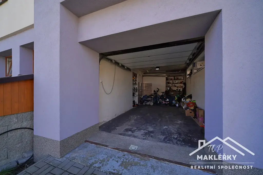 V zadní části u domu je hliníková pergola s otočnými lamelami (jednu stranu lze zastínit stahovací přepážkou) a bazén 3x6m. Střecha rovná, plechová. Do garáže je vstup pouze zvenčí.