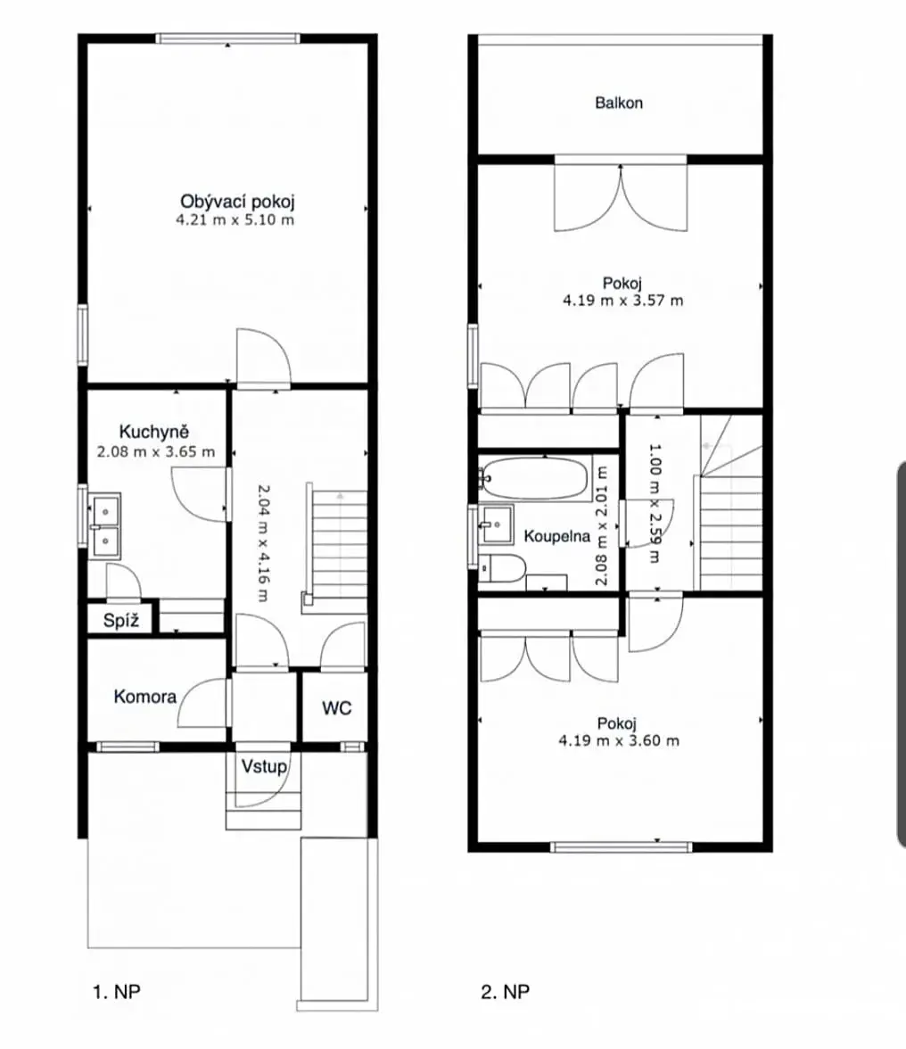 Přízemní část bytu nabízí vstupní chodbu, obývací pokoj, kuchyň, koupelnu s vanou, samostatnou toaletu a schodiště, kterým se dostaneme do horního patra. V horním patře nalezneme 2 pokoje, koupelnu se sprchovým koutem a toaletou.