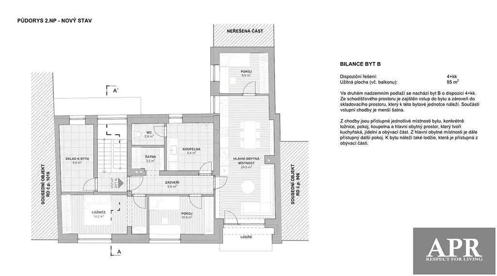 Ve druhém nadzemním podlaží se nachází byt o dispozici 4+kk. Ze schodišťového prostoru je zajištěn vstup do bytu a zároveň do skladovacího prostoru, který k této bytové jednotce náleží. Součástí vstupní chodby je menší šatna.