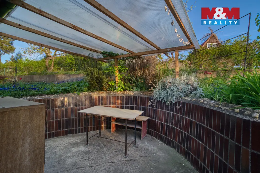 Pozemek je oplocený, ideální pro relax i pro majitele psů. Najdete zde skleník, ovocné stromy, bylinky i příjemné místo na posezení nebo práci venku.