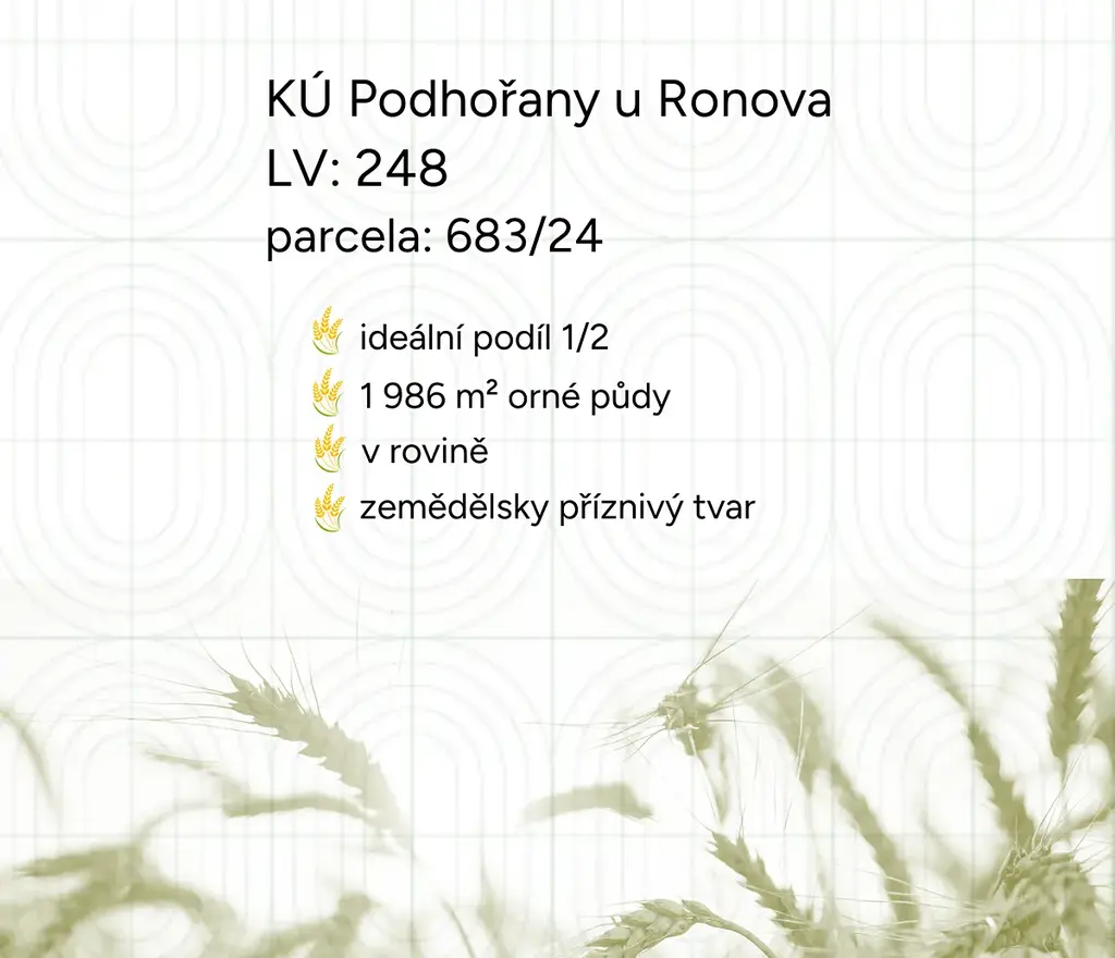 Nabízím k prodeji vlastnictví na zemědělském pozemku v katastrálním území Podhořany u Ronova, okres Chrudim. Pozemek je zapsán na LV 248 a jedná se o parcelu č. 683/24.