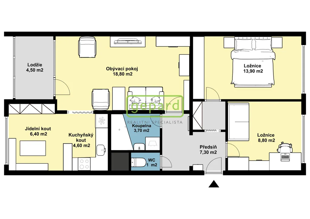 · dvě samostatné neprůchozí ložnice (13,9 m² a 8,8 m²)