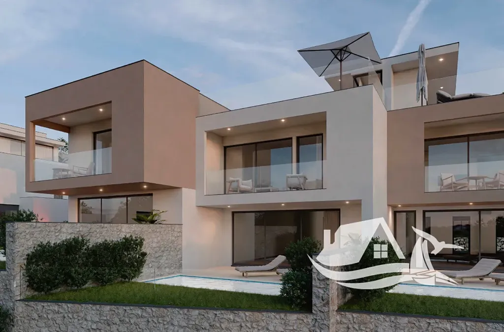 Jedná se o prostorný řadový dům s celkovou netto užitnou plochou 204,04 m², který je rozložen do tří podlaží. Díky trojpodlažnímu řešení působí nemovitost vzdušně, nabízí více soukromí a umožňuje komfortní rodinné i rekreační využití. V přízemí se nachází vstupní část, sklad, jedna ložnice, koupelna, moderní kuchyně s jídelnou a prostorný obývací pokoj s velkou posuvnou prosklenou stěnou. Ta otevírá přístup na krytou terasu s výhledem na moře a dále na soukromou zahradu s vyhřívaným bazénem o velikosti 15 m² a sluneční terasou.
