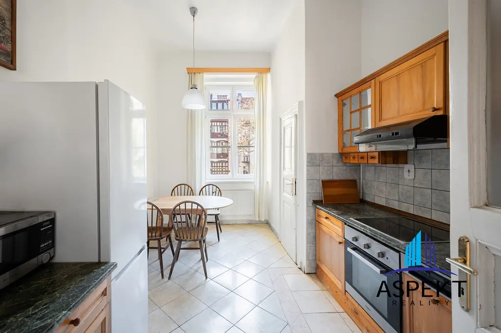 Nabízím zařízený 3+1 (100m²), který se nachází v 2. patře domu s výtahem v ulici Tyršova, Praha 2. Byt se skládá z obývacího pokoje, kuchyně a dvou oddělených ložnic. Koupelna s vanou, pračkou, toaleta je zvlášť. Kuchyně je vybavená kuchyňskou linkou, myčkou, ledničkou, stolem a židlemi. V kuchyni je i malá komora. Vhodné pro studenty.