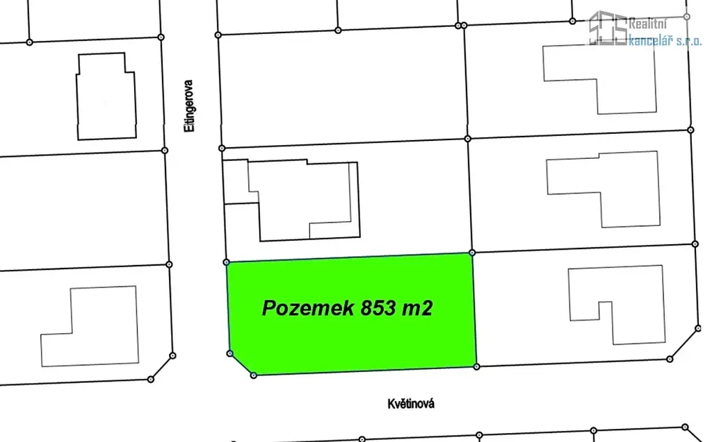 Pozemek určený pro stavbu samostatně stojícího rodinného domu má celkovou výměru 853 m². Je situovaný v severozápadní, klidné, okrajové části obce, v rovinatém terénu, na rohu ulic Eitingerova a Květinová. Parcela má tvar obdélníku s uliční částí o šíři 20 metrů orientovanou na západ, zahrada bude mít orientaci východní. Okolní zástavba je tvořena novostavbami samostatně stojících rodinných domů. Přístup k pozemku je z obecní komunikace.