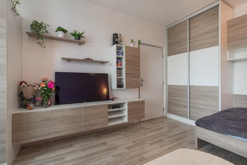 Cena včetně vybavení - nábytek na míru, postel, skříň šatní, sedačka, obývací stěna