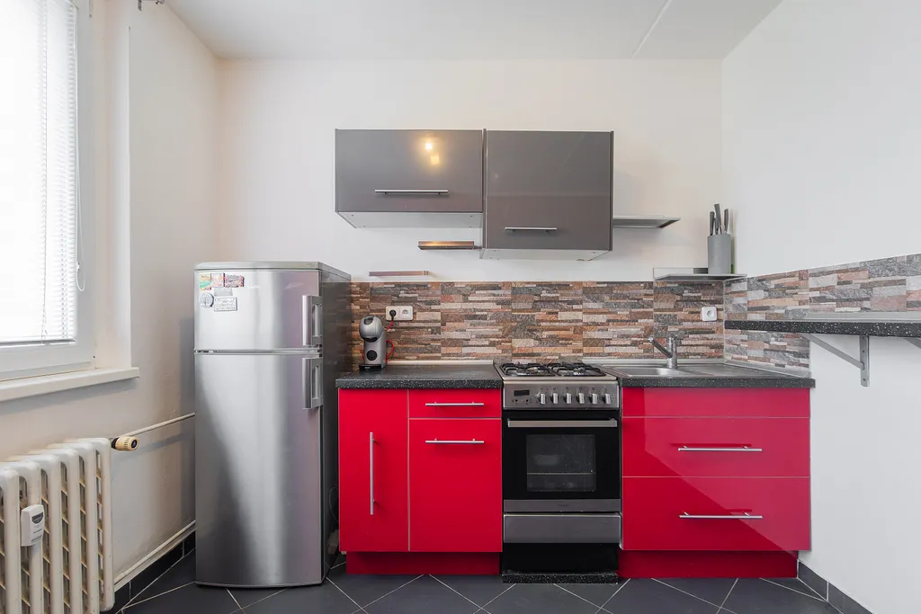 kuchyně, pračka, lednice.
