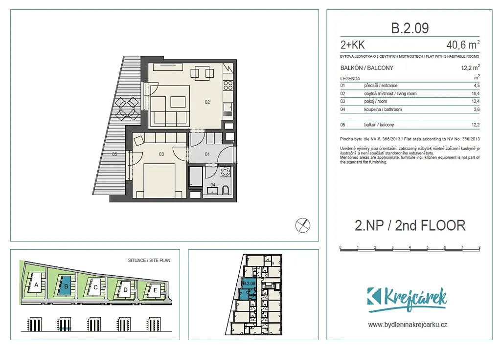 Nabízíme k prodeji byt 2+kk ve 2. nadzemním podlaží o ploše 52,8 m² včetně balkonu o velikosti 12,2 m² v zcela novém projektu Bydlení na Krejcárku, ulice Novovysočanská.