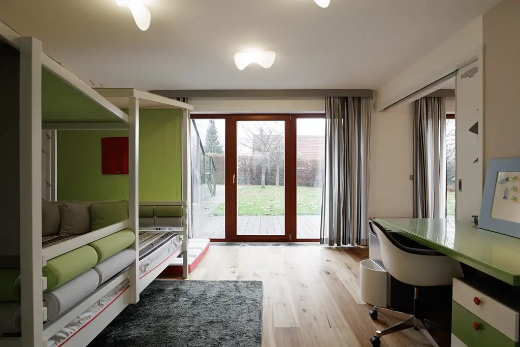 Tento rodinný dům se 7 pokoji a kuchyňským koutem nabízí komfortní a prostorné bydlení v klidné vesnici obklopené lesy, což zajišťuje soukromí a příjemné prostředí. S jihozápadní orientací a efektivním využitím svažitého terénu je interiér příjemně prosvětlený a zahrada o rozloze 1585 m² s vrostlou zelenou vegetací, poskytuje dostatek prostoru pro různé aktivity a relaxaci. Dům byl přestavěn z původní budovy a v roce 2012 byla přistavěna nová část s vegetační střechou.