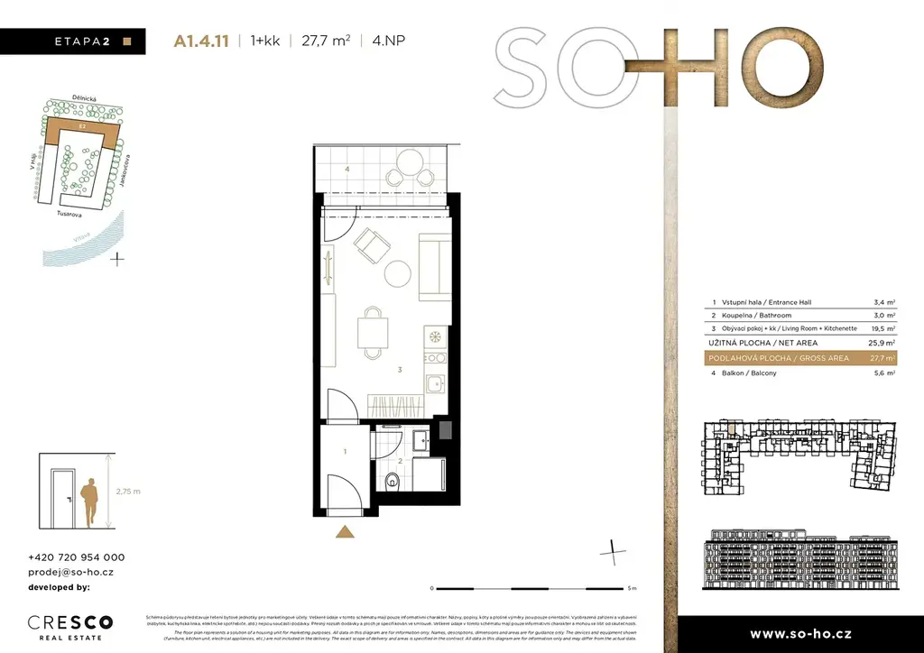 Kompaktní byt o dispozici 1+kk (27,7 m2) s balkonem (5,6 m2) se nachází v 4. nadzemním podlaží moderní novostavby 2. etapy SO-HO Rezidence, v atraktivní lokalitě jižních Holešovic. Promyšlená dispozice maximálně využívá každý metr – ze vstupní chodby se vstupuje do koupelny a do světlého obytného prostoru s kuchyňským koutem, místem pro úložné prostory, jídelní stůl i komfortní relaxační a spací zónu. Na obytnou část plynule navazuje balkon, ideální pro ranní kávu či odpočinek po práci.