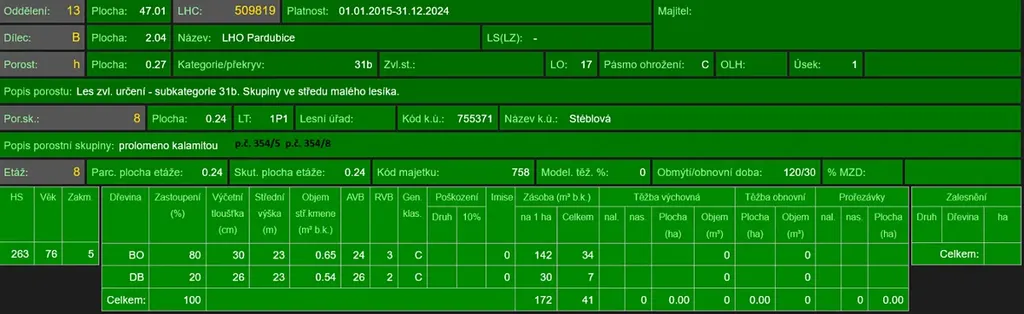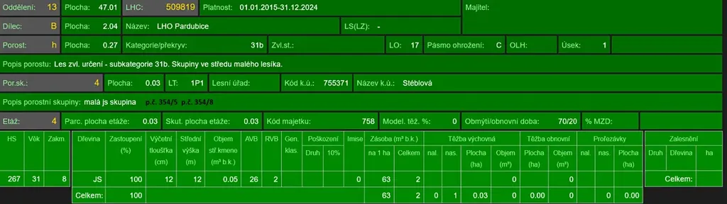 - p.č. 354/5 vedená jako lesní pozemek o celkové výměře 2040 m2, z toho vlastníme podíl 1/3 tedy 680 m2 (stáří lesa 87 let - zastoupení dřevin borovice, dub, stáří lesa 42 let - zastoupení dřevin jasan),