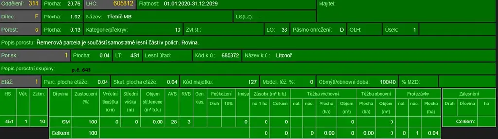 - p.č. 645 vedená jako lesní pozemek o celkové výměře 1 268 m2, z toho vlastníme podíl 1/4 tedy 317 m2 (stáří lesa 7 let - zastoupení dřevin smrk),