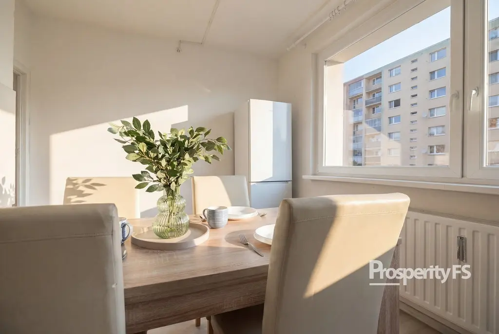 Nachází se ve 3. nadzemním podlaží zatepleného domu s výtahem. Byt je v udržovaném stavu – kuchyňská linka, koupelna s vanou, plovoucí podlahy, v ložnici koberec. Jádro a elektřina jsou původní. Vytápění i ohřev vody jsou řešeny dálkově. Energetická náročnost budovy je třídy B. Byt zůstane částečně vybavený.