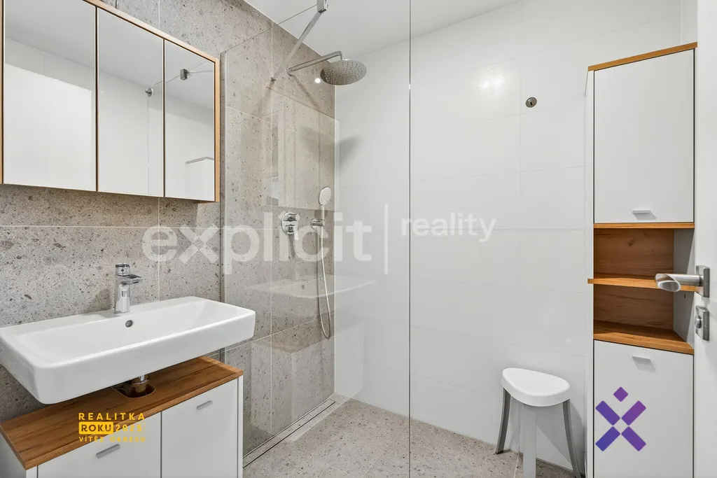 Koupelna se sprchovým koutem, elektrickým žebříkem, samostatné WC naproti ložnice, plastové okna s trojskly, venkovní elektrické žaluzie ve všech oknech i sítě proti hmyzu, bezpečnostní vstupní dveře, vysoké interiérové dveře výšky 220 cm a velkým zázemím tohoto bytu je prostorná šatna přímo vedle ložnice s přípojkou na pračku i sušičku a prostorem na skříně.