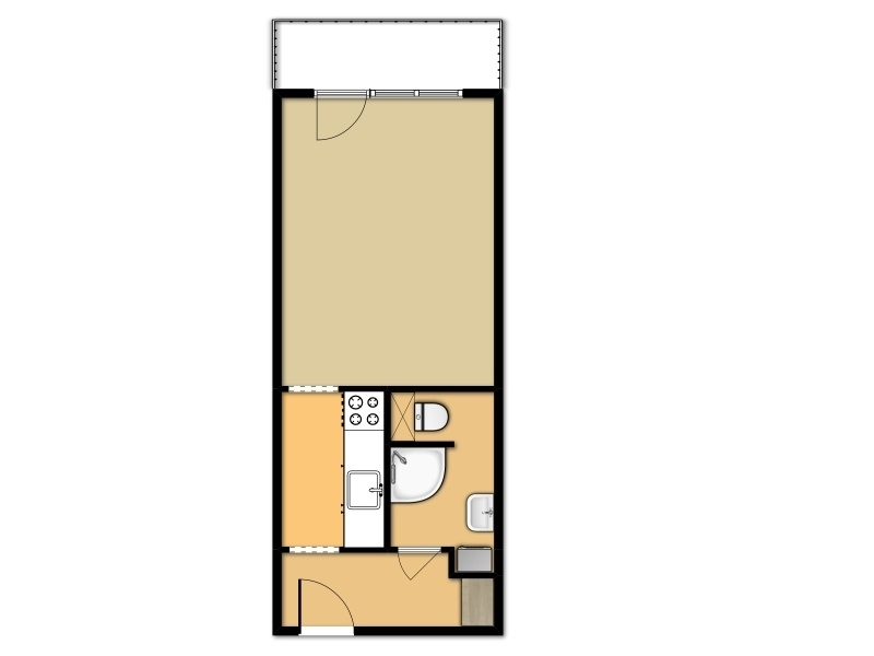 Dispozice bytu nabízí vstupní chodbu s dostatkem prostoru pro skříně, zděnou koupelnu se sprchovým koutem, toaletou, umyvadlem a prostorem pro pračku. Hlavní obytný prostor je řešen jako obývací pokoj s kuchyňským koutem a přímým vstupem na balkon, který poskytuje příjemný, ničím nerušený výhled. Byt se prodává včetně vybavení, což umožňuje okamžité využití bez dalších investic.