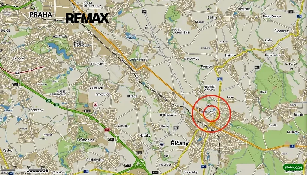 Lokalita vyniká výbornou dostupností do Prahy. Autem jste na dálnici D1 za pouhých 10 minut (6 km). Skvěle funguje i hromadná doprava – zastávka autobusu se spoji po Říčanech leží jen 100 m od domu. Autobusy na hlavní trase jezdí v krátkých intervalech (10–30 min) od časného rána až do půlnoci. Pro cestu do centra Prahy lze využít i vlak, kterým jste v Praze na hlavním nádraží za pohodlných 30 minut.