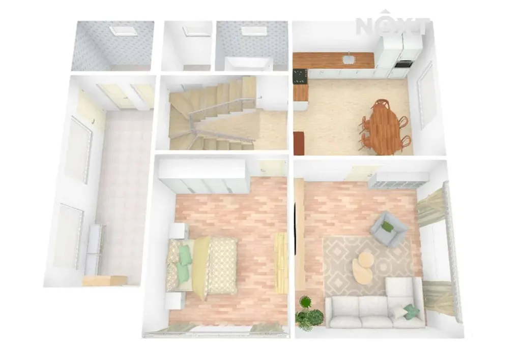 V každém podlaží se nachází koupelna, toaleta, kuchyň a dva průchozí pokoje. Objekt je částečně podsklepený, součástí je také garáž a hospodářské místnosti, které poskytují dostatek prostoru pro uskladnění či dílnu.
