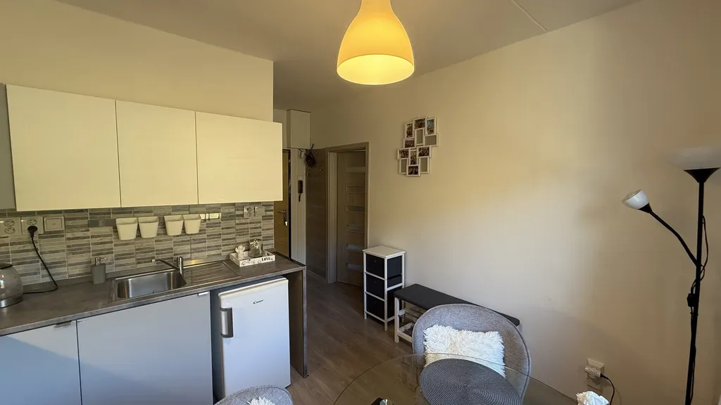 Tento byt s klasickou dispozicí 1+1, sestávající ze vstupní chodby, koupelny s WC, velké moderní kuchyně s jídelním koutem, prostorného obývacího pokoje s ložnicí a výstupem na lodžii, již na první dojem působí velmi útulně a příjemně.