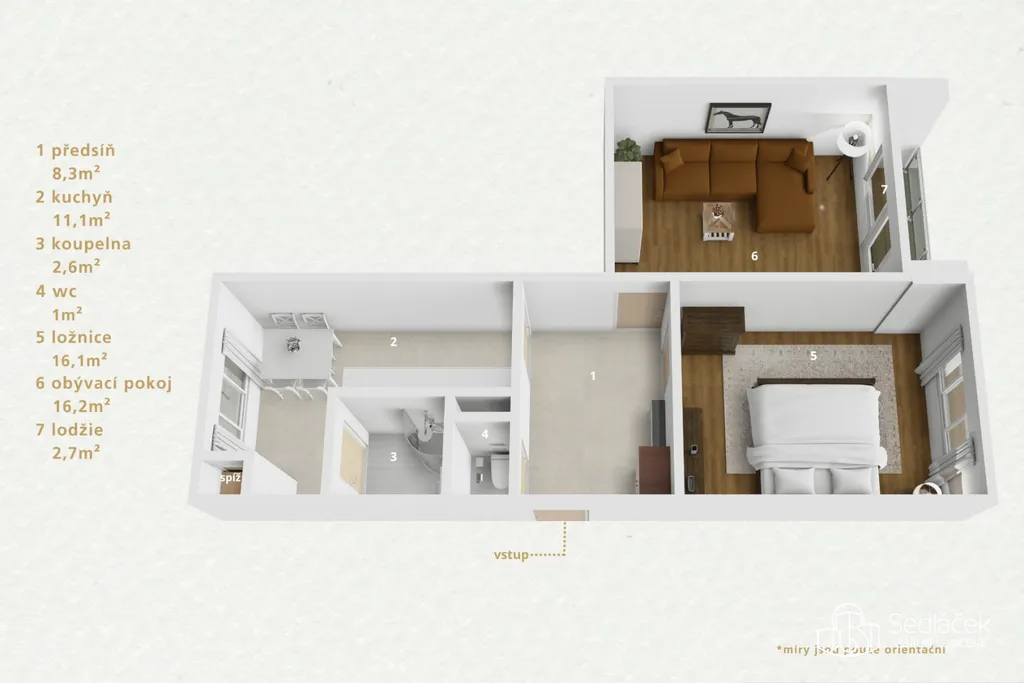 Dispozice bytu je praktická a velmi dobře řešená. Kuchyně je samostatná s dostatkem prostoru pro kuchyňskou linku i jídelní stůl. Obývací pokoj se vstupem na lodžii, samostatná ložnice. Vstupní chodba nabízí dostatek místa pro vestavěné skříně. Koupelna je vybavena sprchovým koutem, toaleta je samostatná. K bytu náleží také sklepní kóje.