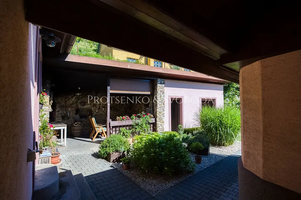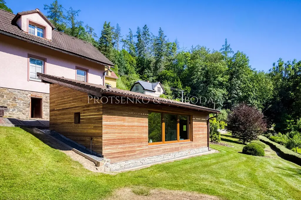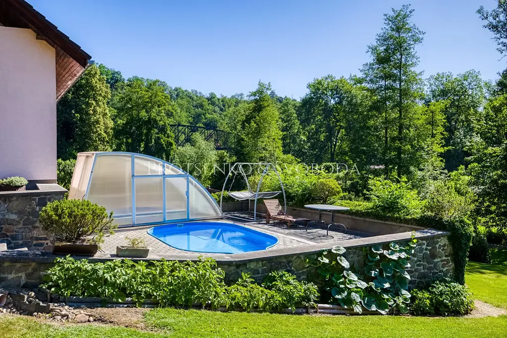 Uvnitř domu vás přivítá obývací pokoj s krbovými kamny, které vnášejí hřejivou atmosféru a pocit skutečného domova. Dvě prostorné garáže nabízejí možnost rozšíření obytné části o další pokoje či ateliér, podle vašich představ. Na pečlivě upraveném pozemku potěší plně funkční udírna pro milovníky poctivé gastronomie, venkovní bazén pro letní osvěžení a samostatný zahradní domek proměněný v privátní wellness zónu s útulnou saunou – ideální místo k odpočinku a regeneraci.