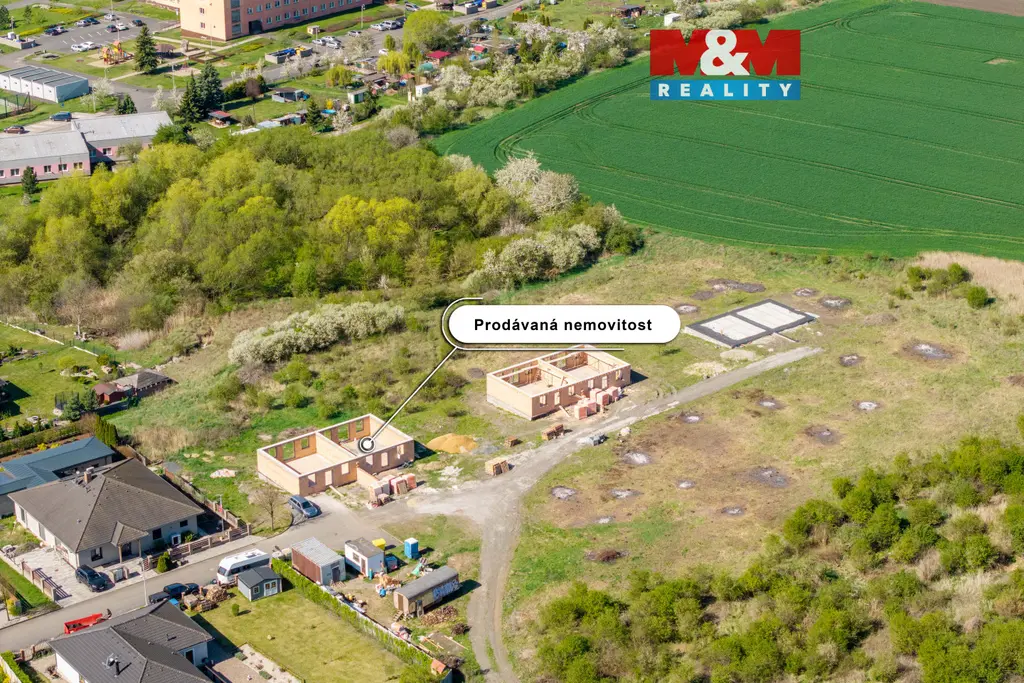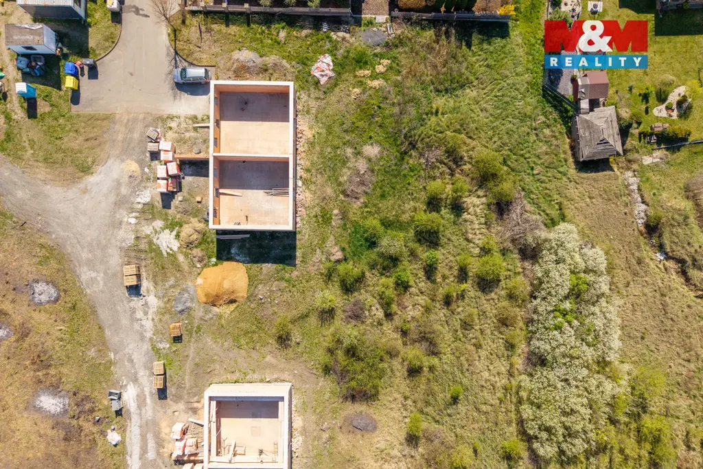 V malebné obci Hrušovany u Chomutova Vám nabízíme ke koupi pozemek o celkové výměře 827 m² s hrubou stavbou poloviny dvojdomku o jednom nadzemním podlaží s obytným podkrovím, který bude napojen na jednotlivé přípojky k hranám pozemků se stavebním povolením a schváleným projektem. V současné době je stavba ve fázi postaveného prvního nadzemního podlaží a dokončení čeká na Vaše návrhy a přání.