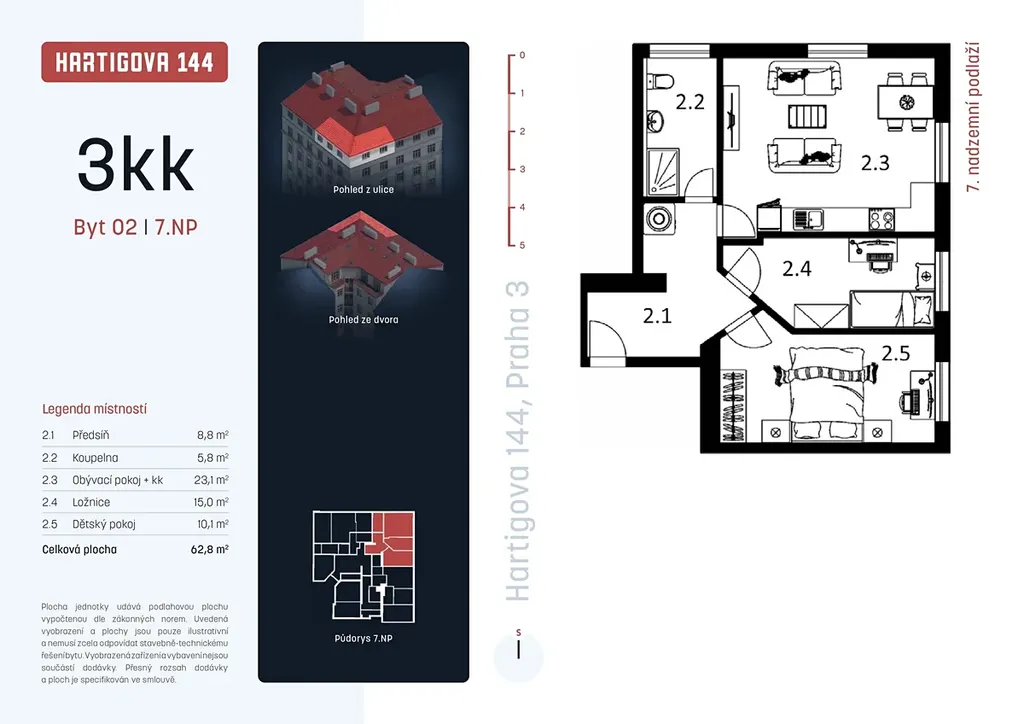 Nový půdní byt 3+kk o ploše 63 m² v projektu Hartigova 144 na pražském Žižkově. Celý dům prochází kompletní rekonstrukcí, která zahrnuje novou fasádu, střechu, veškeré rozvody, instalaci výtahu i modernizaci společných prostor. Rekonstrukce přitom respektuje původní architektonický charakter domu z počátku 20. století. Termín dokončení ve 4. čtvrtletí 2027.