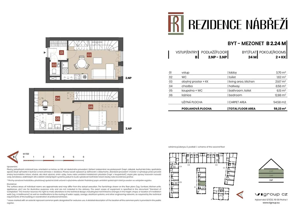 Exkluzivní mezonetový byt 2+kk v Brandýse nad Labem-Staré Boleslavi. Tento byt se nachází v netypické lokalitě ostrova v klidné části obce a je součástí projektu Rezidence Nábřeží. Byt se nachází na 2. a 3. podlaží soliterního domu B a má celkovou podlahovou plochu 56 m². Hlavní orientace bytu je v severojižním směru. Na spodním, vstupním podlaží nelezneme obývací pokoj s kuchyňským koutem a samostatným WC, na vrchním podlaží ve 3.NP domu je pak po interiérovém schodišti přístupná ložnice a také koupelna s WC. Ta je přisvětlena přírodním světlem ze střešního okna. Kromě ložnice, je k dispozici také malá pracovna přiléhající ke koupelně, která má střešní okno na severní stranu.