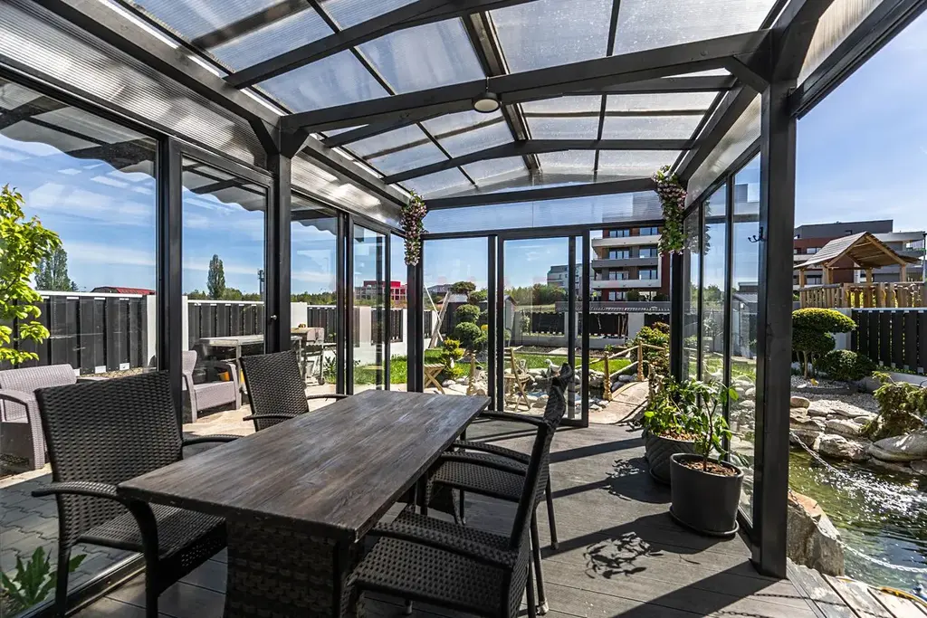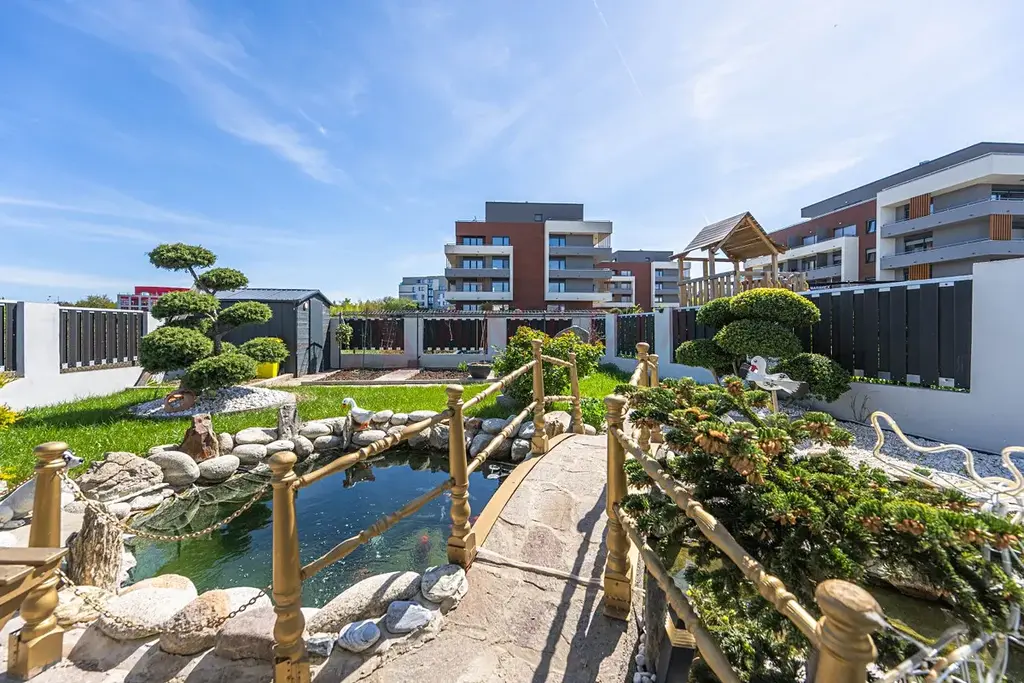 Na oploceném pozemku je upravená zahrada s jezírkem, vzrostlou zelení, zpevněnými chodníky a zahradním domkem. Před domem jsou k dispozici další dvě parkovací stání na vlastním pozemku.