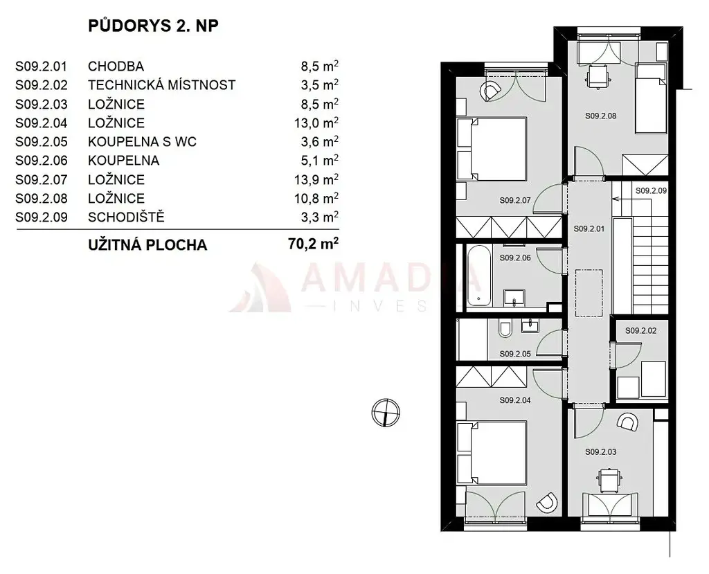 V patře jsou čtyři neprůchozí pokoje, dvě koupelny (jedna s WC) a technická místnost.