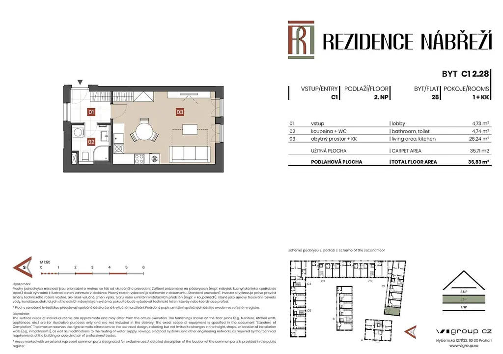 Oblíbená a prakticky řešená dispozice bytu 1+kk se severo-jižní orientací. Byt je situovaný ve 1. nadzemním podlaží budovy a jeho součástí je prostorný obývací pokoj s kuchyňským koutem, vstupní hala a koupelna s WC. Pamatuje se také na úložné prostory umístěné v chodbě za vstupními dveřmi. Byt je vhodný jako investiční byt pro budoucí pronájem nebo také jako bydlení pro singles.