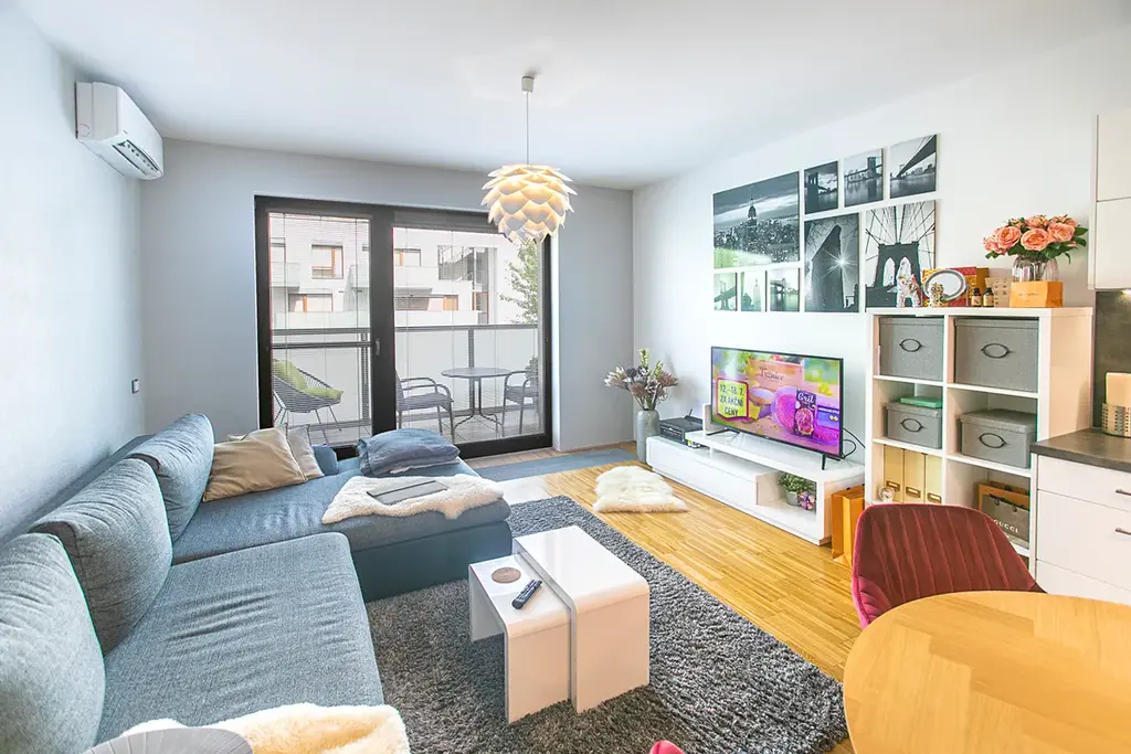 Interiér nabízí obývací pokoj s plně vybavenou kuchyňskou linkou a přímým vstupem na balkon, samostatnou ložnici s manželskou postelí a velkou šatní skříní, koupelnu s vanou, samostatnou toaletu a samozřejmostí je také klimatizace pro maximální komfort.