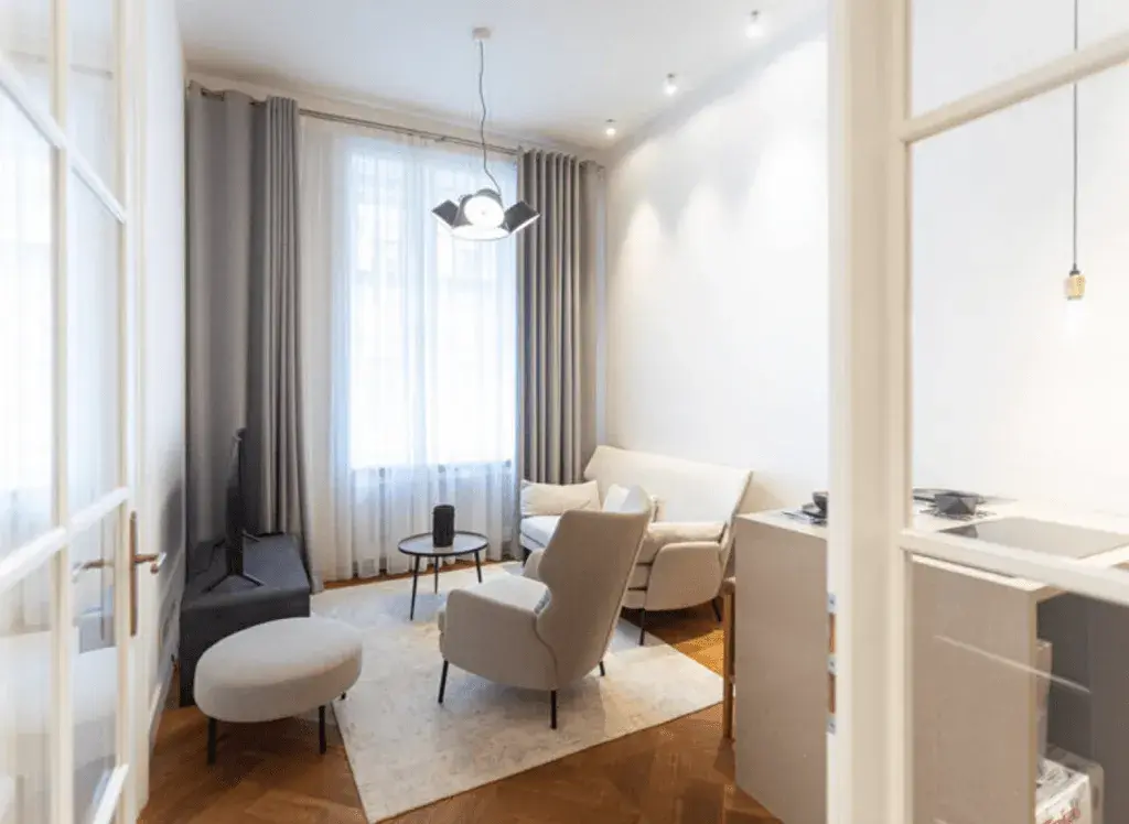 Tento výjimečný byt je zařízen nábytkem na míru s důrazem na detail, funkčnost a nadčasový design. Dispozice zahrnuje světlý obývací prostor s plně vybavenou kuchyňskou linkou, samostatnou ložnici a koupelnu se sprchovým koutem.