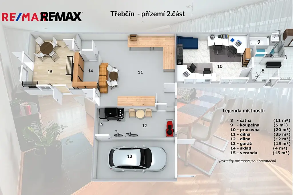 V exkluzivním zastoupení majitele nabízíme k prodeji dům se zahradou v Třebčíně nedaleko Olomouce. Vícepodlažní dům s půdou je částečně podsklepený s garáží, dílnou a skladovými prostory. Vytápění je ústřední s plynovým kotlem umístěným v suterénu a dále je provedena příprava pro krbová kamna. Dům je napojen na veřejnou kanalizaci, vodovod, plyn a elektřinu. V domě jsou plastová okna, laminátové podlahy a sádrokartonové podhledy. V 1. NP se nachází obývací pokoj s jídelnou, kuchyně, koupelna (vana, sprcha, umyvadlo, WC), vstupní hala, WC, prádelna. V přístavbě 1. NP se nachází pracovna, předsíň, šatna, koupelna (není dokončena, příprava pro sprchu, umyvadlo a WC). V této přístavbě lze řešit samostatnou obytnou jednotku nebo prostor pro podnikání. Ve 2.NP se nachází 3x ložnice, koupelna (sprcha, umyvadlo), skladový prostor s možným užitím jako šatna. Půda je svojí rozlohou a charakteristikou určená k případné půdní vestavbě.