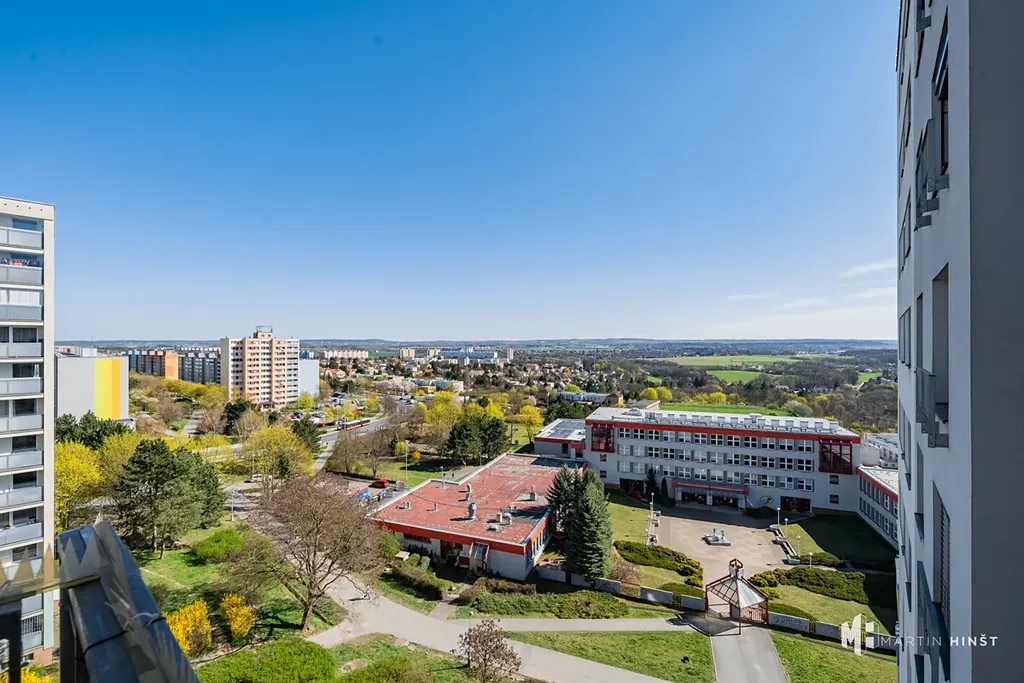 Dispozice nabízí obytný pokoj s kuchyňským koutem a vstupem na balkon, praktickou koupelnu se sprchovým koutem a menší předsíň. Z vyššího patra je příjemný výhled do okolí a byt poskytuje dostatek světla pro útulné a funkční bydlení. V domě je k dispozici výtah a centrální dálkové vytápění.
