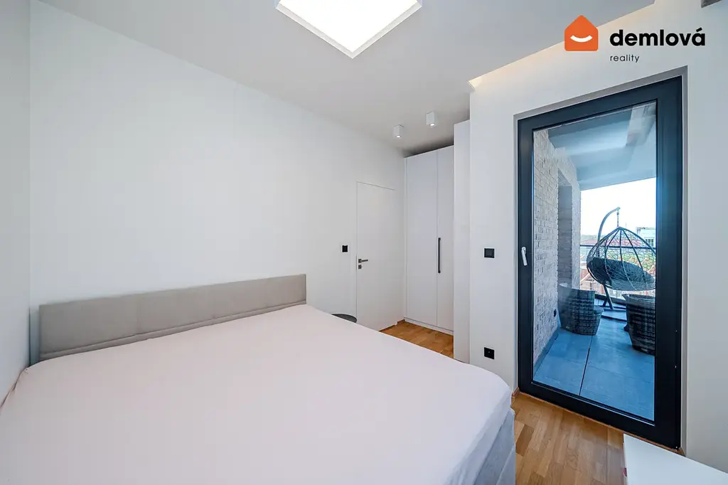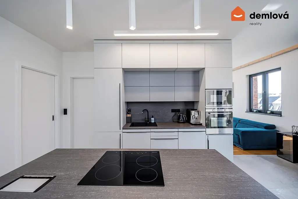 Byt zaujme hned na první pohled – čisté linie, kombinace betonu, dřeva a velkoformátových ploch vytváří nadčasový a velmi vkusný interiér. Velká okna v celém prostoru zajišťují dostatek denního světla a příjemnou atmosféru.