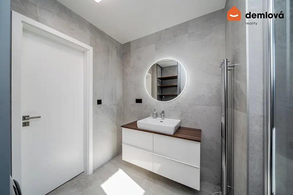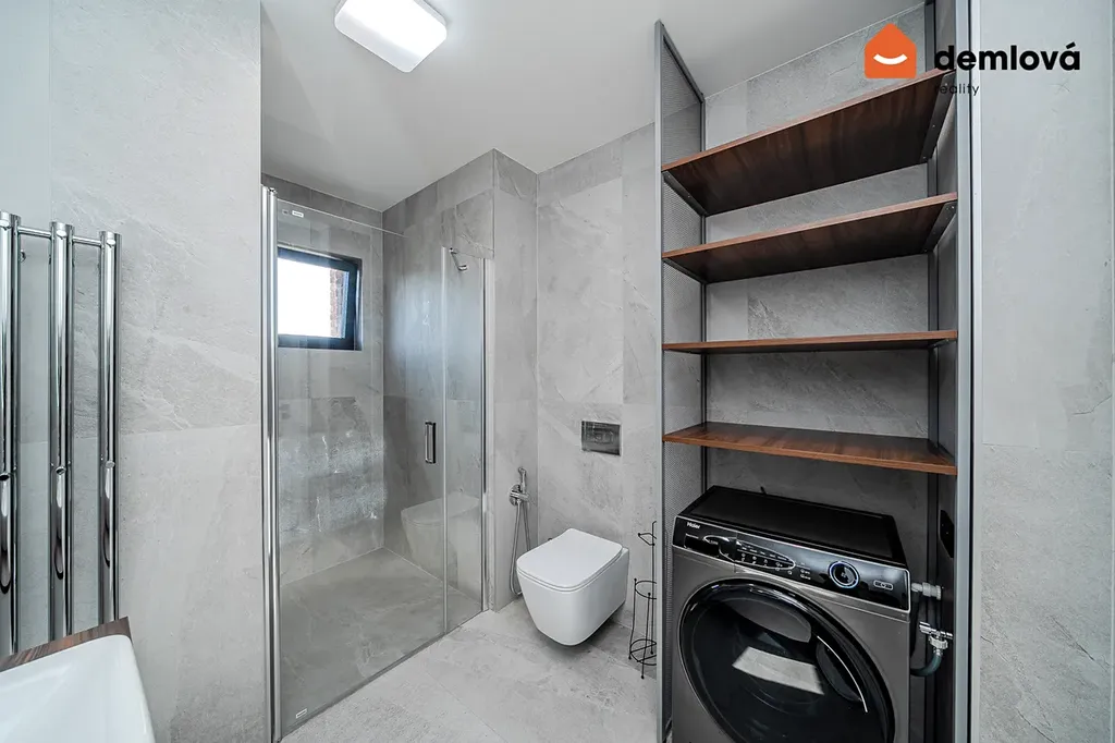 Koupelna je laděna do moderního stylu s velkoformátovými obklady, sprchovým koutem, závěsnou toaletou a úložnými prvky na míru. Součástí vybavení je také pračka.