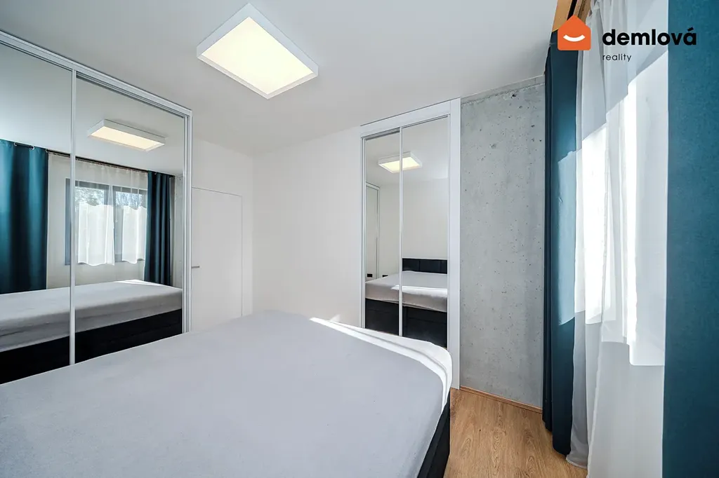 Byt disponuje dvěma samostatnými ložnicemi s neprůchozím řešením, vestavěnými skříněmi a dostatkem úložného prostoru. Interiér je vybaven kvalitními materiály – dubové podlahy, velkoformátová dlažba a designové prvky včetně pohledového betonu.
