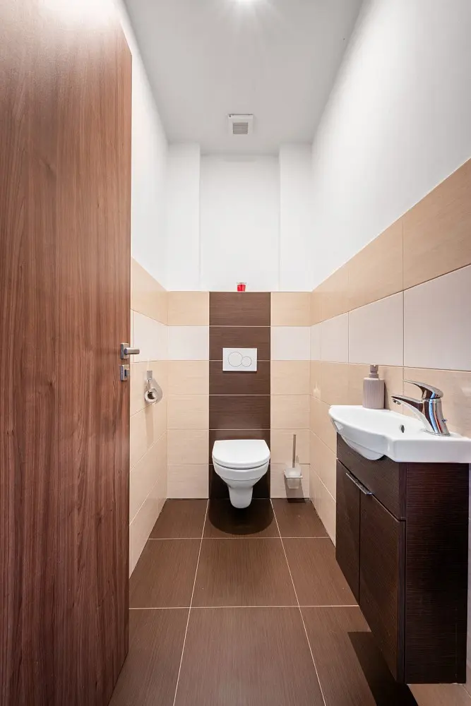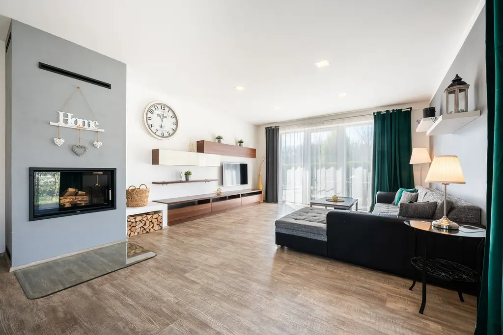 Dům je dispozičně řešen jako 4+kk s užitnou plochou 167 m². Po vstupu vás přivítá prostorné zádveří s dostatkem úložného prostoru. Na pravé straně se nachází velkorysý obývací pokoj propojený s kuchyní a jídelnou, odkud je přímý vstup na terasu. Na levé straně najdete koupelnu a samostatné WC, dále chodba vede do ložnice, dvou samostatných pokojů a technické místnosti, kterou lze využít například i jako šatnu.