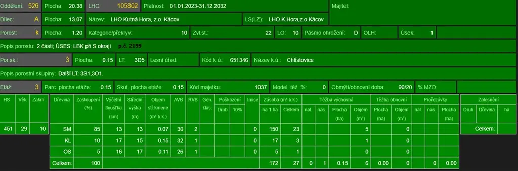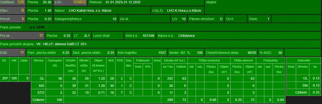 - p.č. 2199 vedená jako lesní pozemek o celkové výměře 3 393 m2, z toho vlastníme podíl 1/4 tedy 848 m2 (stáří lesa 91 let - zastoupení dřevin habr, dub, smrk, stáří lesa 32 let - zastoupení dřevin smrk, javor, topol),