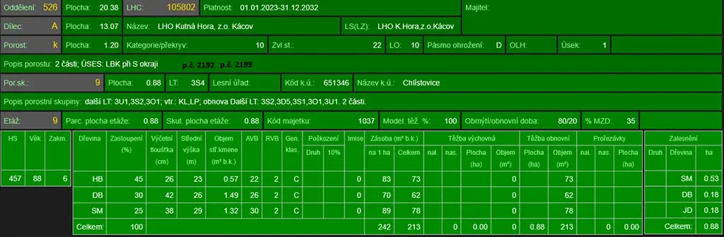 - p.č. 2192 vedená jako lesní pozemek o celkové výměře 8 607 m2, z toho vlastníme podíl 1/4 tedy 2 152 m2 (stáří lesa 91 let - zastoupení dřevin habr, dub, smrk),