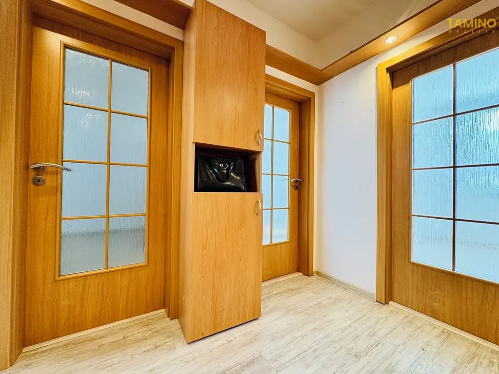 Nabízíme k pronájmu luxusně zrekonstruovaný byt 3+1 s výtahem, zasklenou lodžií a prostorným sklepem o ploše 72 m², na prestižní adrese Jaroslava Haška, Třebíč. Byt je částečně vybaven s důrazem na kvalitu – samozřejmostí je šatna, elegantní obložky dveří a prvotřídní laminátová podlaha. Samostatný záchod, nádherná kuchyně se stolem a čtyřmi židlemi a kombinovaný sporák zůstanou k dispozici. V bytě najdete lednici, mikrovlnku, pračku, rychlovarnou konvici a bohaté úložné prostory. K nastěhování ihned. Každý detail je nový – od elektroinstalace po vybavení. Lokalita je naprosto ideální – do 200 m zastávky, školy, školky i obchodů. Pouhých 50 m od domu je park s lesem ideální na procházky. Parkování přímo před domem. Nájemné 16 500 Kč + zálohy na energie 5 000 Kč. Provize 16 000 Kč.