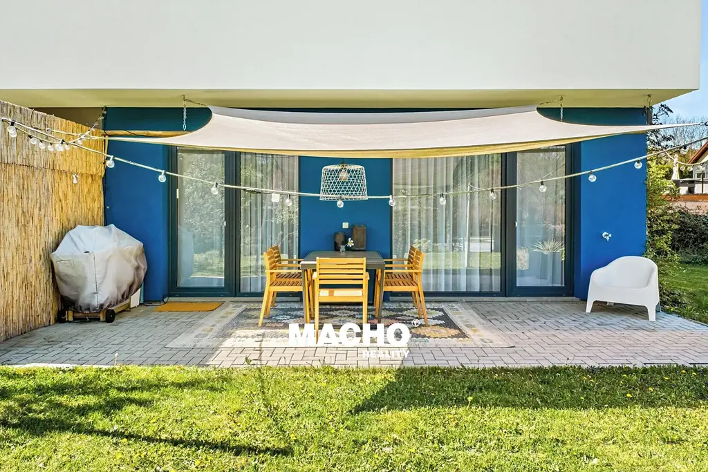 Právě venkovní prostor je jedním z největších benefitů této nabídky , 222 m² soukromé zahrady a terasy nabízí naprostý nadstandard pro relaxaci, grilování, posezení s přáteli i bezpečný prostor pro děti.